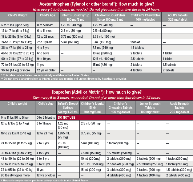 - The correct dose for your child is based on their weight, not their age. Do not guess their weight — acetaminophen and ibuprofen can be dangerous when given in the wrong dose.