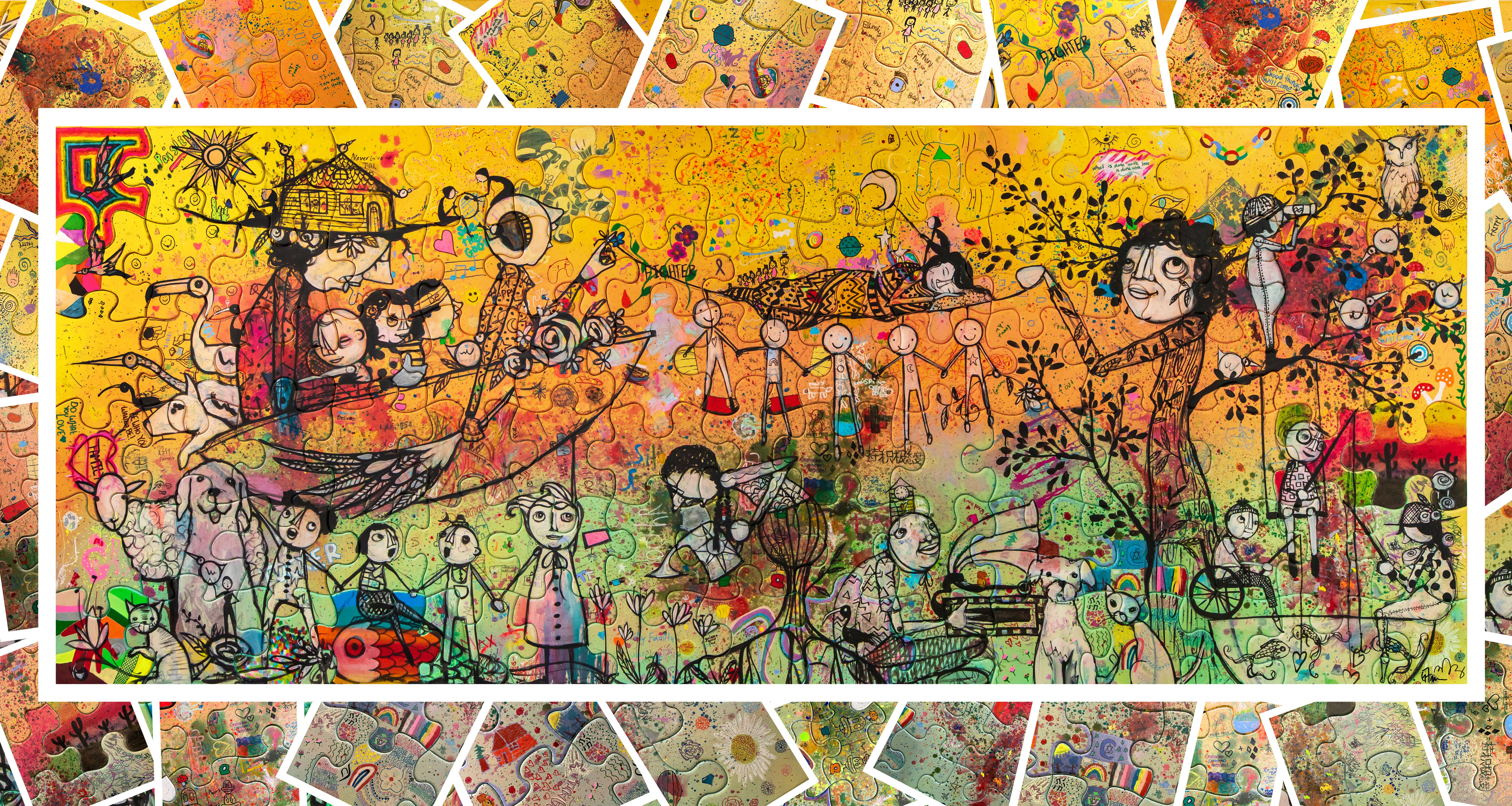 Kids worked with art therapist, Brittany Dray, to design large puzzle pieces representing their stories. Duong and Friedman gathered the pieces and added their interpretation of the kids’ connected experiences to create a massive, wall-size mural, exhibit puzzle — the largest professional-kid collaboration puzzle in Oklahoma, we think. This final show piece will become a permanent part of Oklahoma Children’s Hospital, continuing to inspire and connect the experiences of kids for years to come.