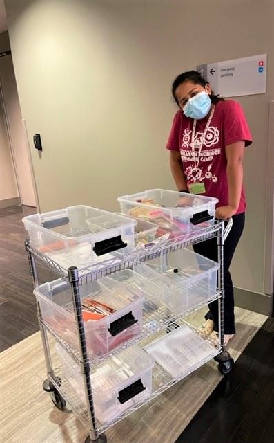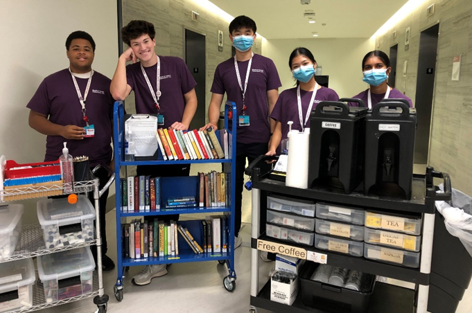 Activity Cart and Book Cart volunteers round on patient rooms providing activities, such as books,
