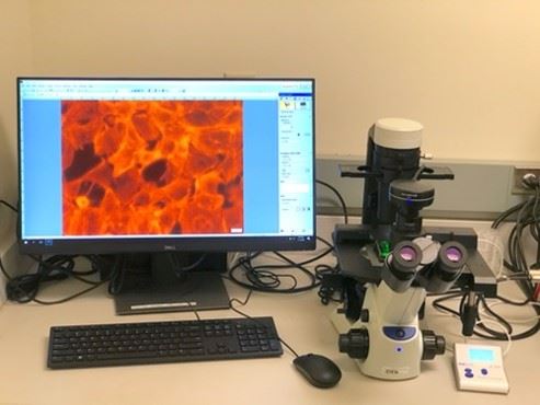 The Olympus inverted microscope is equipped with 4X, 10X and 20X objectives for viewing cells in cell culture dishes. There are 3 different fluorescence excitation and emission set ups available: DAPI, GFP and RFP. The microscope is equipped with a camera to capture images at low magnification.